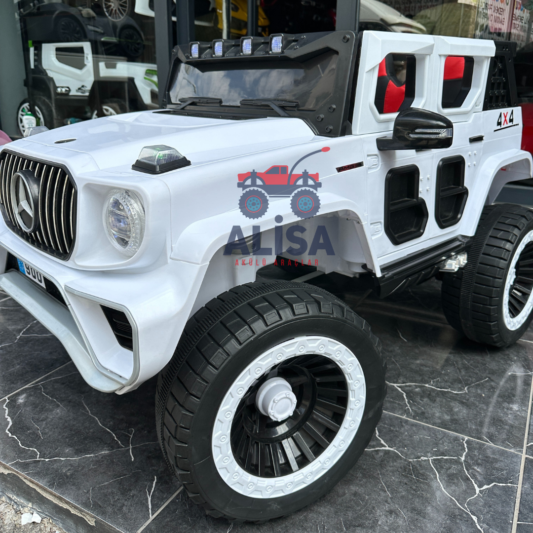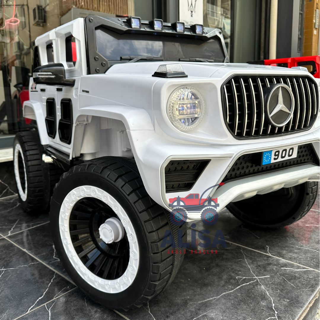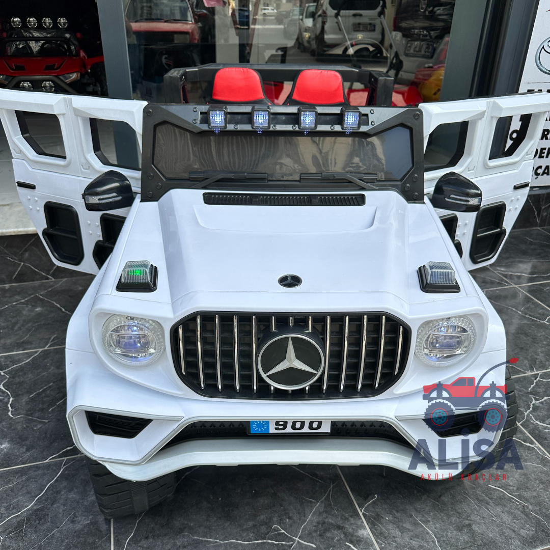 Beyaz Mercedes G900 Işıklı Jeep, çocuklar için tasarlanmış özel bir akülü arabadır. 12 volt gücüyle çalışır ve 4×4 özelliği sayesinde her türlü arazi koşulunda güvenli ve keyifli bir sürüş deneyimi sunar.